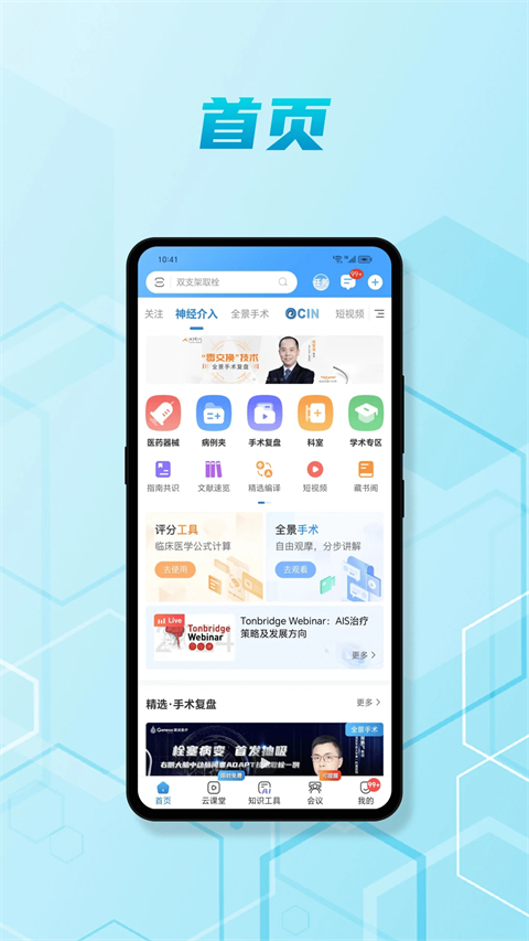 以视频方式传播国内外最具价值的病例分享、国内外科研成果等信息,为神经外科、神经介入同仁提供极其丰富的医学教育视频资料。云课堂涵括神经肿瘤、脑血管病外科、脑血管病介入、功能神外、脊髓脊柱、颅脑创伤/神经重症、小儿神外、颅脑和脊柱畸形、基础研究、特殊技术、感染、护理等多种分类的视频,是神经外科、神经介入医生及医学生进行在线医疗学习的优质医学移动课堂。