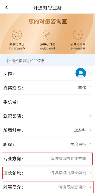 填写您的专业方向,擅长领域,对患简介等相关信息。